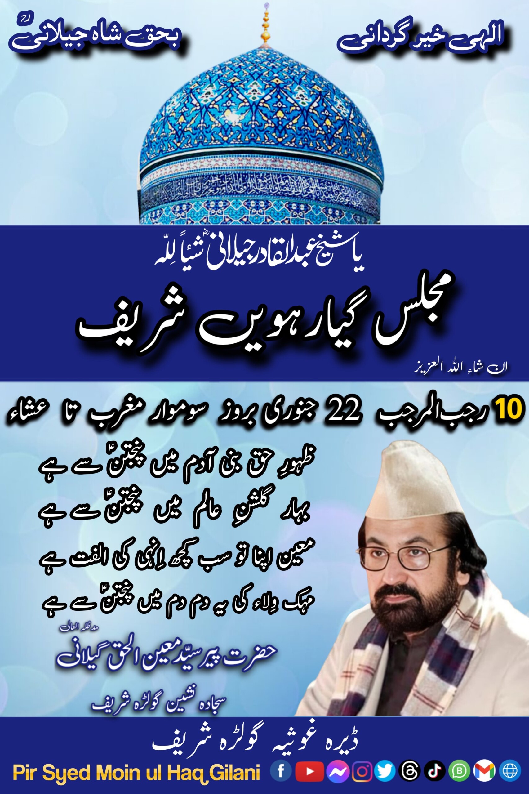On the eleventh evening of each lunar month, a heartwarming spiritual ceremony to nourish the souls and hearts of the devotees is also arranged at Dera Ghousia Golra Sharif, Islamabad by Pir Sahib. In this ceremony lectures on the teachings of Prophet Muhammed (SAW) and other Sufi Masters especially Hazrat Ghaus-e-Azam, Sheikh Abdul Qadir Gilani